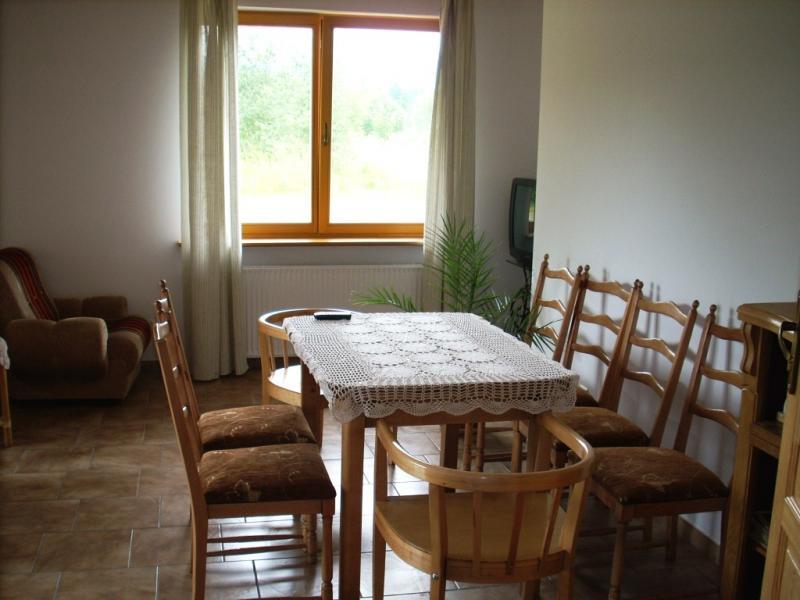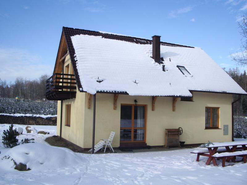 Nasz dom jest w pełni dostępny dla gości i pomieści do 11 osób. Znajduje się na skraju wsi, na 4-hektarowej działce z zarybionym stawem, który latem zmienia się w naturalne kąpielisko. Z okien rozpościera się zapierający dech widok na Karkonosze.