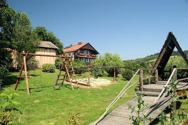– Plac zabaw z zjeżdżalnią, huśtawkami, piaskownicą, domkiem na drzewie i trampoliną