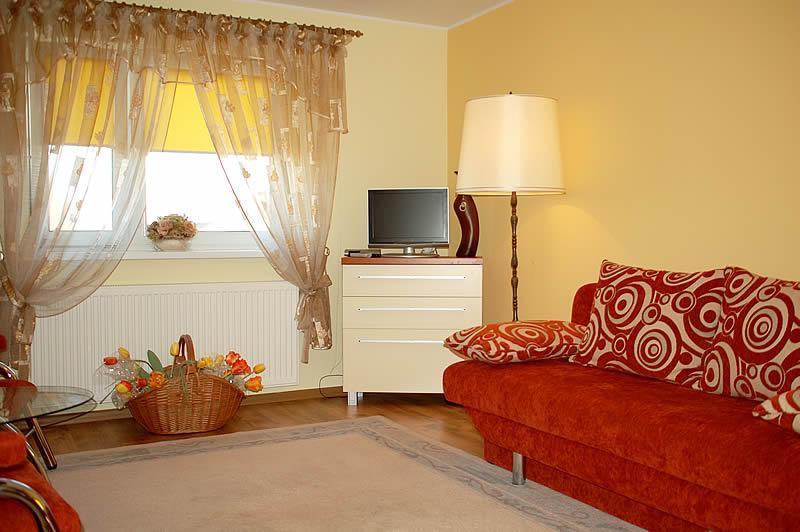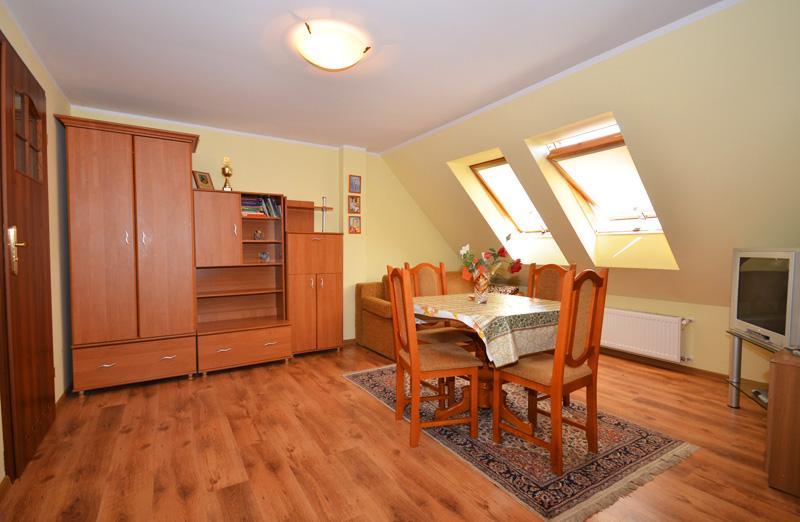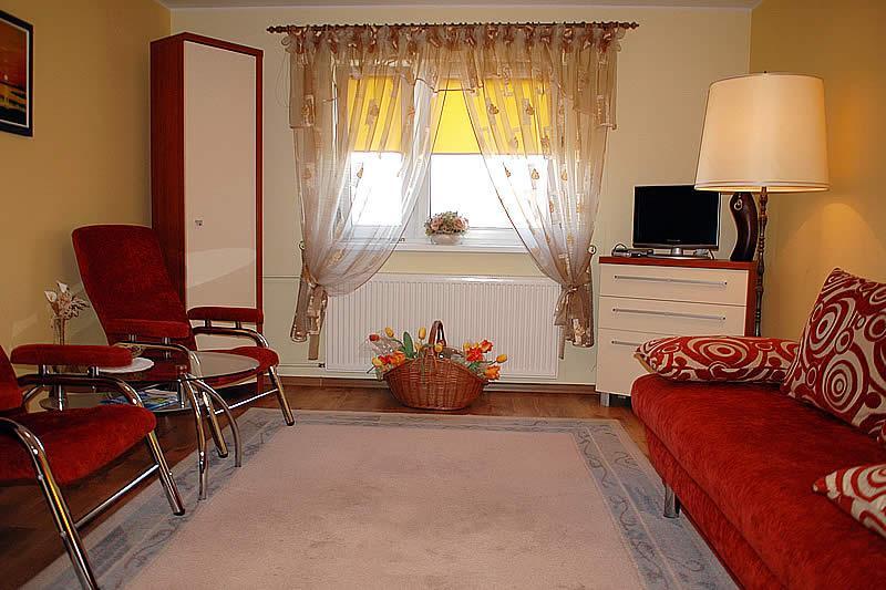 – Apartament dla 4 osób: Składa się z pokoju gościnnego z telewizorem, oddzielnej sypialni, aneksu kuchennego z lodówką, czajnikiem bezprzewodowym oraz naczyniami, a także łazienki.