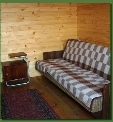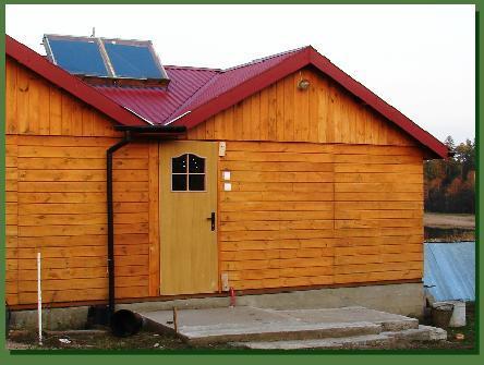 – Drewniany domek z tarasem z widokiem na jezioro,
