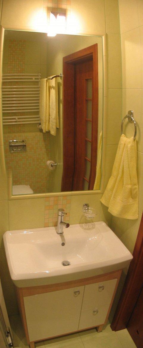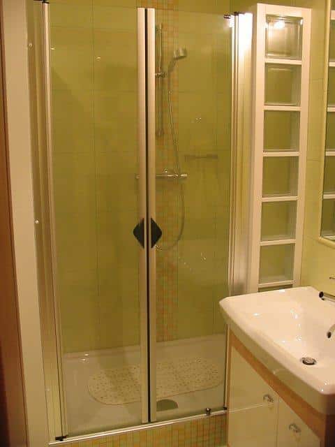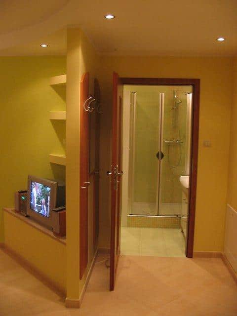 – Łazienka z dużą kabiną prysznicową, WC i umywalką,
