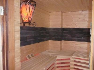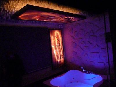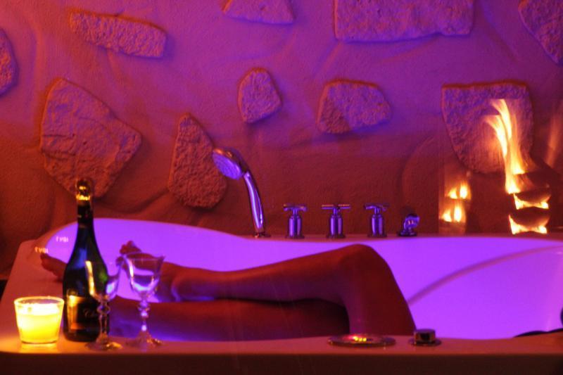 – Jacuzzi z widokiem na ścianę kominkową, oddzielone od salonu szklaną ścianą.