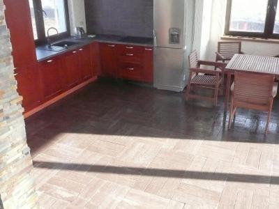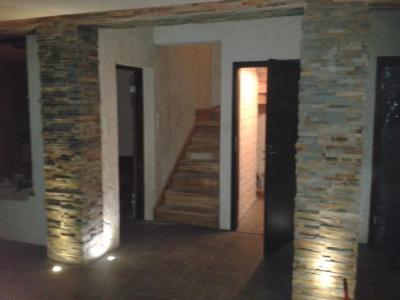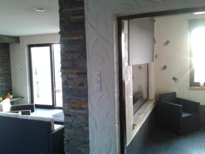 – Przestronny salon (40m2) z telewizorem, SAT, DVD, ścianą kominkową wykonaną z naturalnego kamienia oraz wyjściem na duży taras.