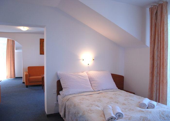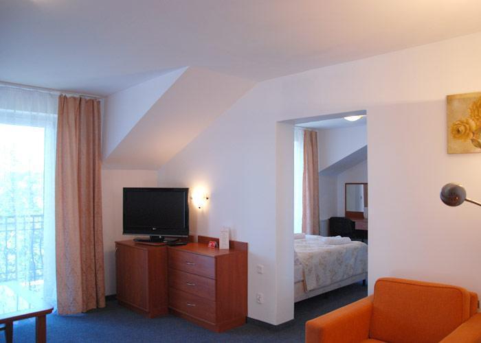 – 3 apartamenty (2 z dużym łóżkiem i pojedynczym, 1 w stylu królewskim z dużym łóżkiem).