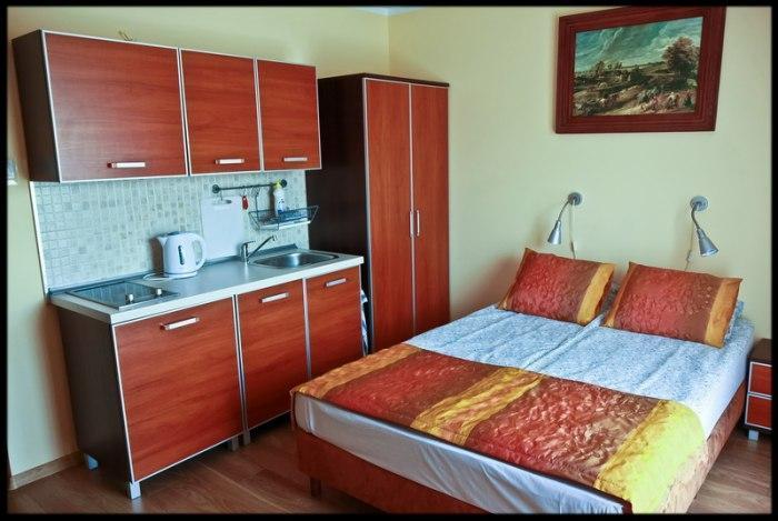 Oferujemy 26 miejsc noclegowych w elegancko urządzonych pokojach typu studio oraz w jedno- i dwuosobowych pokojach z łazienkami. Każdy pokój wyposażony jest w telewizor z programami satelitarnymi oraz bezprzewodowy Internet. Na piętrze znajdują się kuchnie, gdzie można samodzielnie przygotować posiłki. Większość pokoi posiada balkony, co pozwala cieszyć się świeżym powietrzem i widokami.