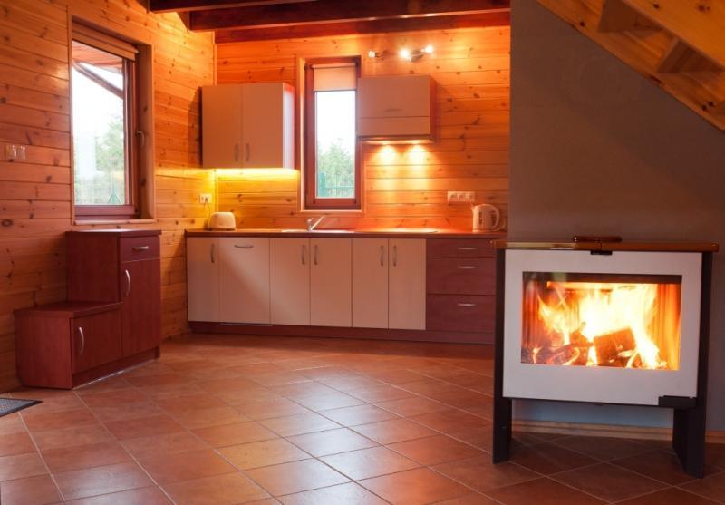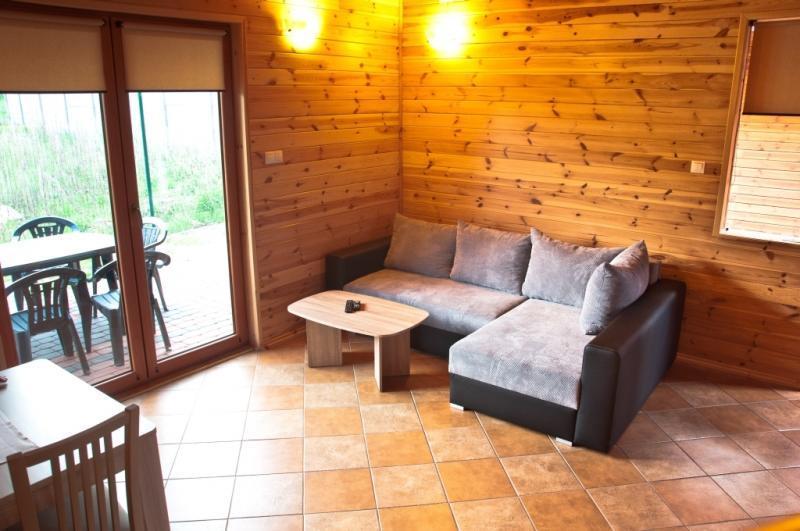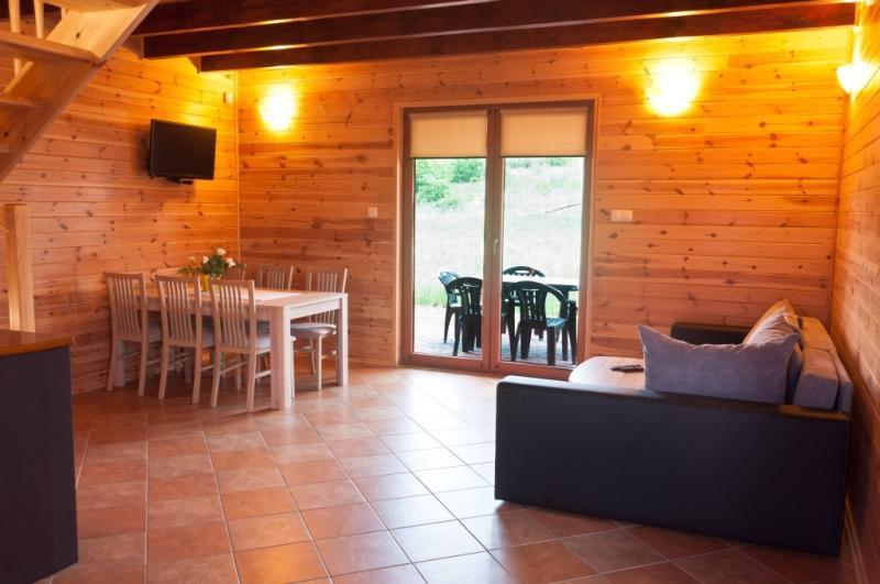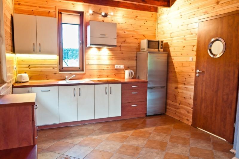 – Salonik i kuchnia: narożnik, stół z 6 krzesłami, telewizor, kominek, wieszak na odzież, szafka na buty, meble kuchenne, zlewozmywak, okap, płyta ceramiczna 4-palnikowa, zmywarka, lodówka, mikrofalówka, czajnik elektryczny, toster, komplet garnków, naczyń i sztućców dla 6 osób
