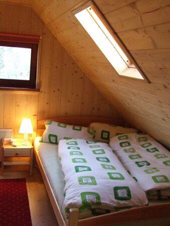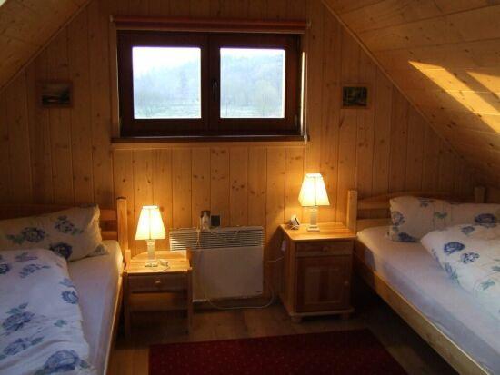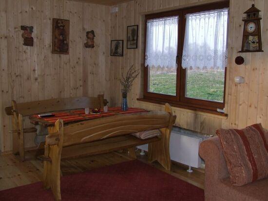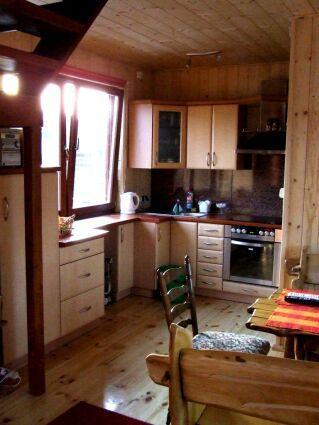 Pierwszy z nich to nowoczesny, drewniany domek o powierzchni 70 m². Wchodząc do środka, poczujesz się jak w domu dzięki przestronnemu salonowi z telewizorem, w pełni wyposażonemu aneksowi kuchennemu oraz komfortowej łazience. Na piętrze czekają na Ciebie dwie przytulne sypialnie oraz łazienka z wanną z hydromasażem, idealna do relaksu po dniu pełnym wrażeń. Domek posiada własne ogrzewanie, co czyni go doskonałym wyborem przez cały rok. To idealne miejsce dla grupy do 8 osób, które mają do dyspozycji cały obiekt.