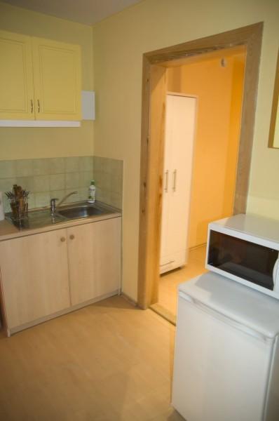 – Funkcjonalnej kuchni wyposażonej w lodówkę, mikrofalówkę, czajnik elektryczny oraz naczynia i sztućce,