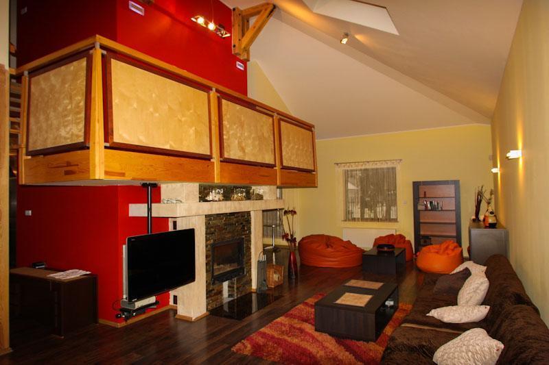 Dom, wykończony w nowoczesnym stylu, jest stworzony z myślą o rodzinach i grupach przyjaciół. Oferujemy również dodatkowe domki letniskowe dla większych grup. Centrum życia towarzyskiego stanowi przestronna kuchnia z jadalnią, wyposażona w nowoczesne sprzęty, takie jak piekarnik z termoobiegiem, pięciopalnikowa kuchenka, duża lodówka i zmywarka. Duży salon z kominkiem, wygodnymi sofami i pufami zapewnia komfortowy wypoczynek. Dodatkową rozrywkę oferuje telewizor LED, konsola XBOX 360 oraz biblioteczka z grami i zabawkami.