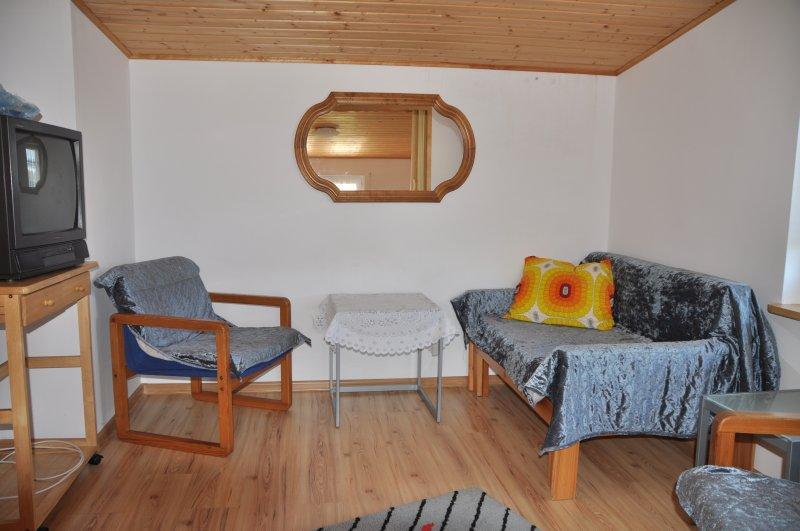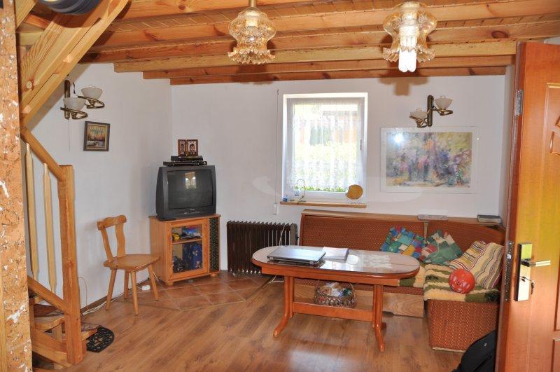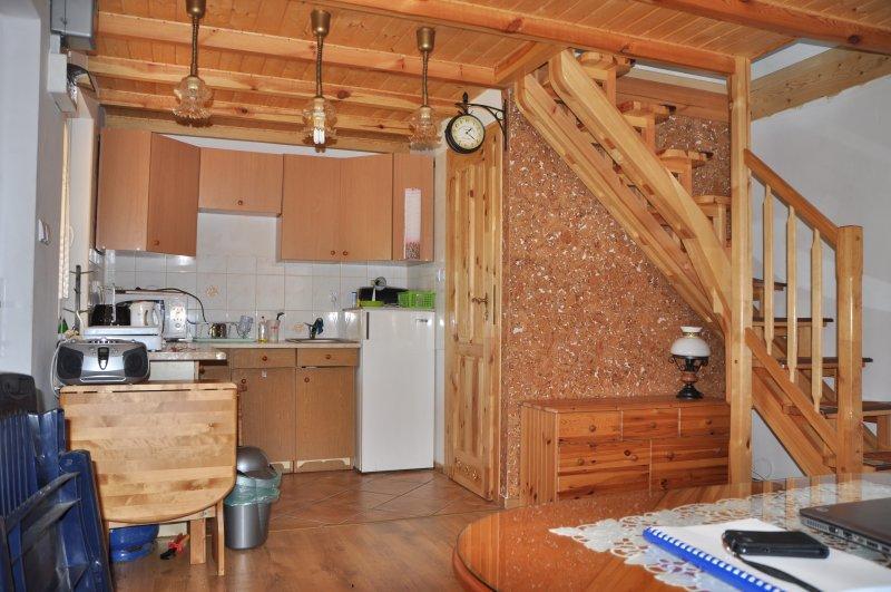 – w pełni wyposażoną kuchnię (kuchenka, mikrofalówka, lodówka, zlewozmywak, garnki, talerze, sztućce i inne niezbędne przybory).