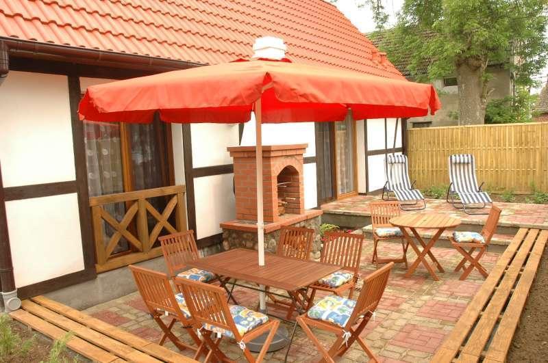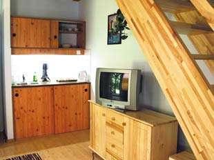 Kompleks składa się z czterech malowniczych chat rybackich, w których znajdują się trzy niezależne, komfortowe mieszkania. Każde z nich ma osobne wejście, co gwarantuje prywatność. W środku znajdą Państwo przestronny pokój dzienny z narożnym kompletem wypoczynkowym, aneks kuchenny oraz łazienkę z prysznicem i WC. Na piętrze mieści się sypialnia dla czterech osób z balkonem. Wszystkie mieszkania są w pełni wyposażone, a telewizor jest dostępny w każdym z nich.