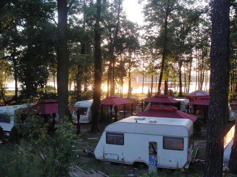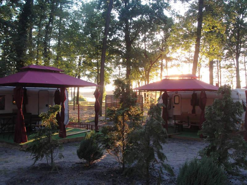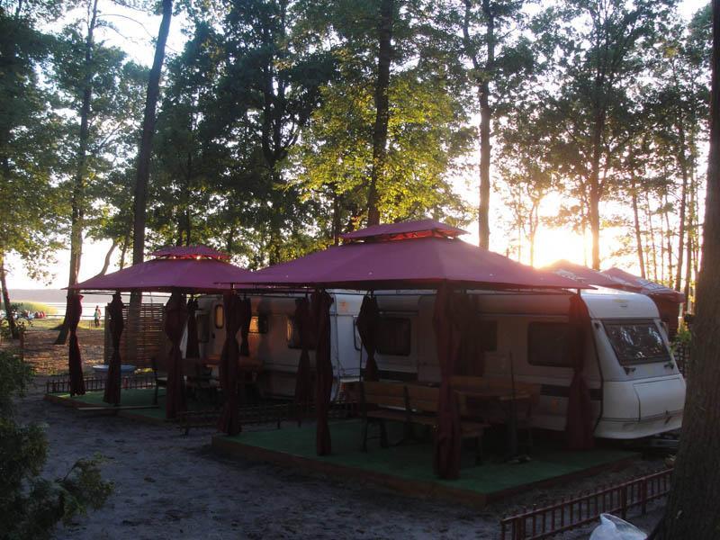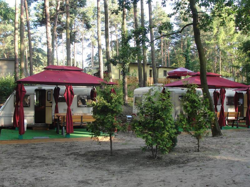Oferujemy 10 komfortowych przyczep, każda z nich zapewnia nocleg dla 4 osób. Przyczepy wyposażone są w taras i namiot, co tworzy przytulne miejsce do relaksu w otoczeniu sosnowego lasu. Wszystkie przyczepy posiadają niezbędne wyposażenie, w tym talerze, sztućce i pościel, a także węzeł sanitarny.