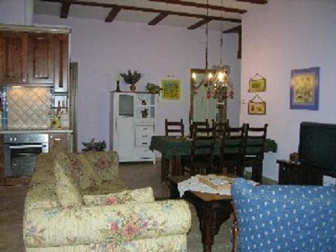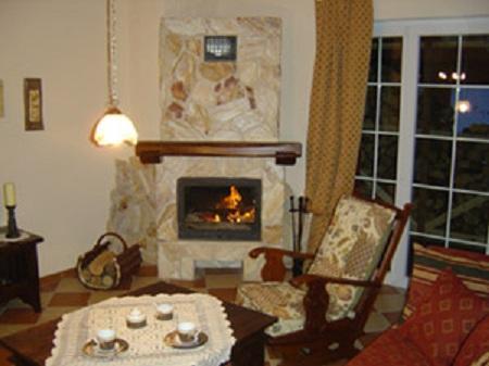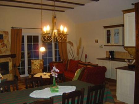 – Pokój dzienny z rozkładaną sofą, stołem, stolikiem i kominkiem,