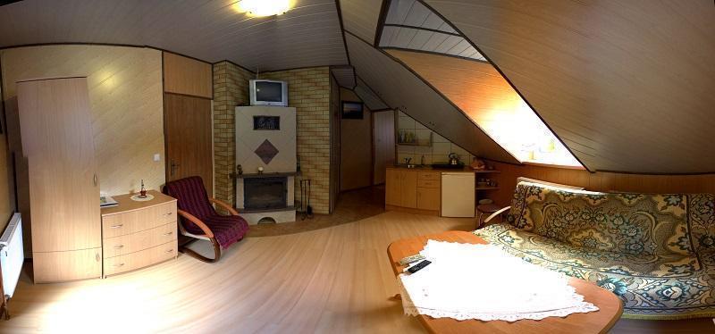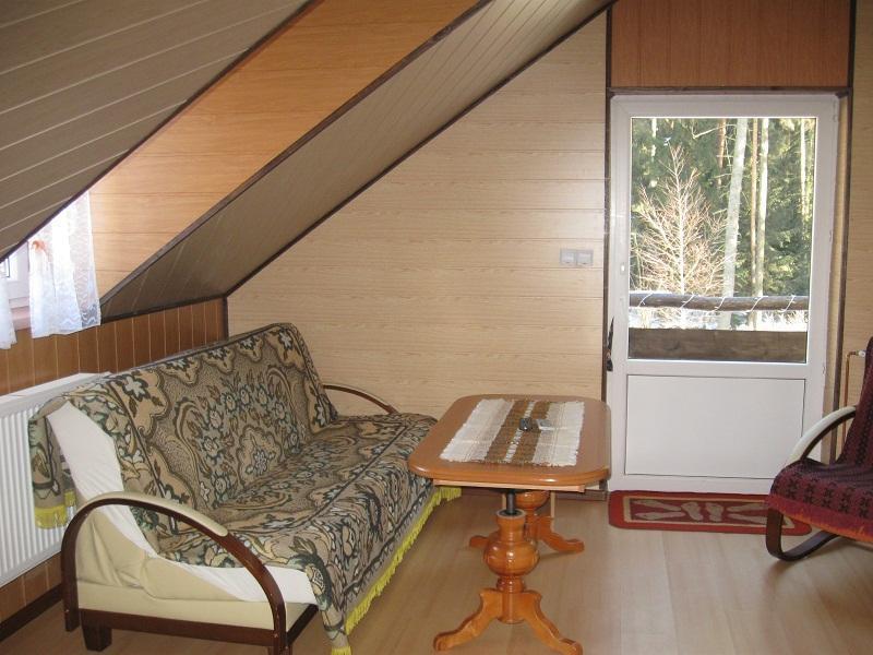 Oferujemy komfortowe zakwaterowanie przez cały rok. Do dyspozycji gości przygotowaliśmy dwa oddzielne mieszkania z niezależnymi wejściami. Część Myśliwska pomieści 7 osób i posiada łazienkę oraz w pełni wyposażony aneks kuchenny. Część Kominkowa, z miejscem dla 5 osób, również oferuje aneks kuchenny i łazienkę, a dodatkowo przytulny kominek.
