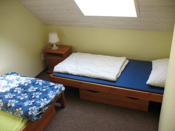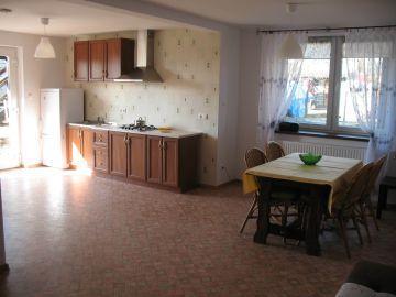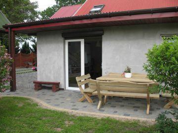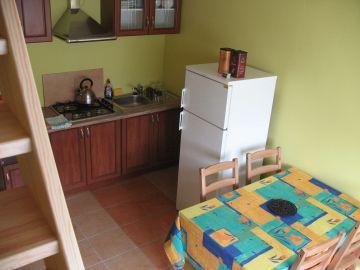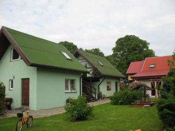 1. **Domek nad garażem** (6 miejsc noclegowych): salon z aneksem kuchennym, łazienka. Cena: 150 zł/dobę przy 4 osobach, każda kolejna osoba 20 zł/dobę (poza sezonem 100 zł/dobę).