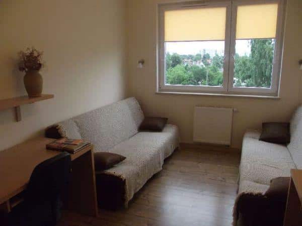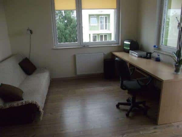 – Drugi pokój: dwie szerokie, składane kanapy, komoda, biurko, krzesło obrotowe, dwie lampki do czytania, żyrandol, radio.