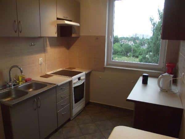 – Kuchnia: lodówko-zamrażarka, kuchnia elektryczna z piekarnikiem, okap, zlew, suszarka do naczyń, ekspres do kawy, czajnik elektryczny, naczynia, sztućce, garnki.
