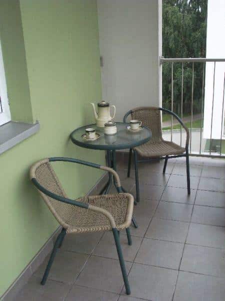– Salon z balkonem: dwie szerokie, składane kanapy, komoda, dwie lampki do czytania, dwie lampy, telewizor.