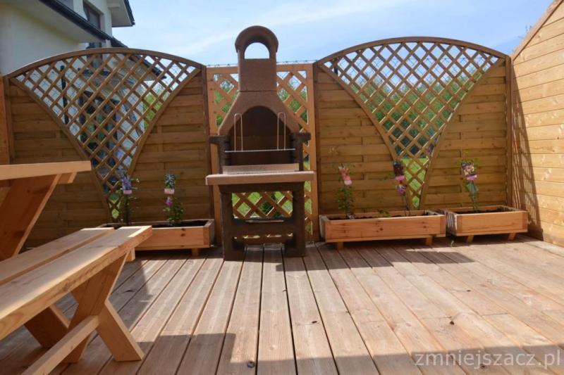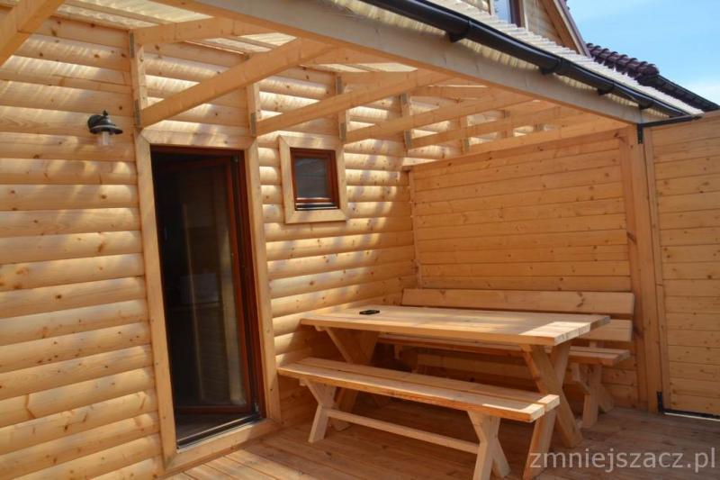 – Zadaszony i oświetlony taras z meblami ogrodowymi (drewniany stół i dwie ławy)