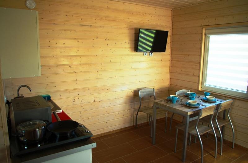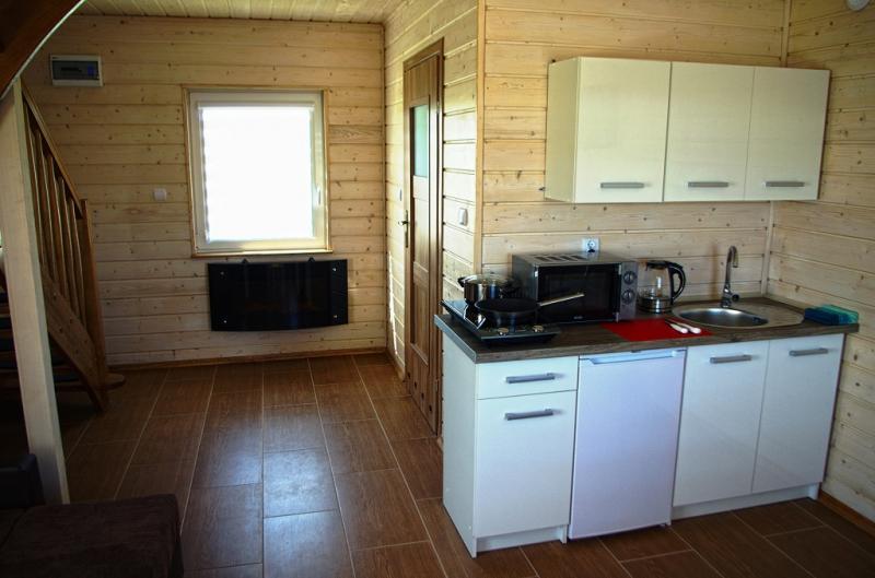 – Kuchnia: mikrofalówka, czajnik bezprzewodowy, płyta indukcyjna, lodówka z zamrażarką, komplet garnków, stół jadalniany z krzesłami, komplet sztućców i zastawy stołowej dla 6 osób