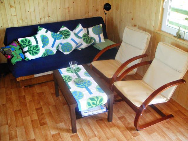 – przytulny salon z jadalnią, oddzielony stołem z krzesłami.