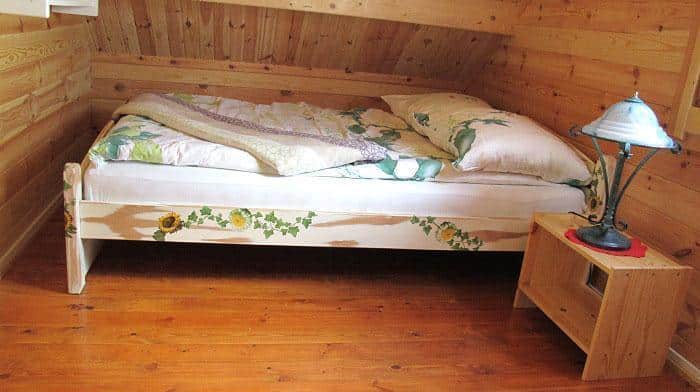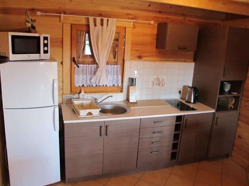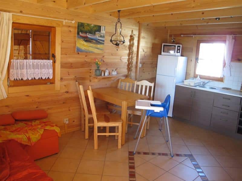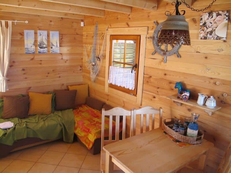 Oferujemy komfortowe zakwaterowanie w 6-osobowych domkach z drewna, o powierzchni 50 m². Każdy domek posiada przestronny salon (25 m²) z telewizorem LCD, wygodną sofą narożną, stołem oraz w pełni wyposażonym aneksem kuchennym. Na parterze znajduje się także łazienka z prysznicem z hydromasażem i radiem. Na piętrze znajdą Państwo dwie oddzielne sypialnie, każda dla trzech osób.