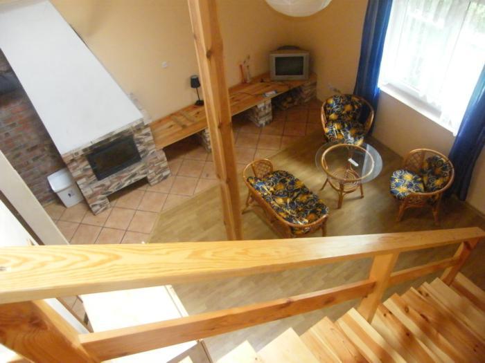 – Dużego pokoju z kominkiem, telewizorem i aneksem kuchennym,