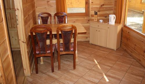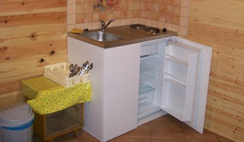 – Domki drewniane 4-osobowe z zadaszonym tarasem, łazienką, mini kuchnią z lodówką, czajnikiem i naczyniami.