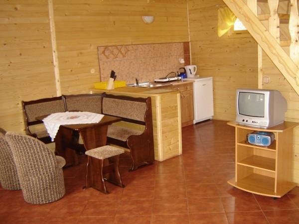 Każdy domek wyposażony jest w dwie niezależne sypialnie, salon z aneksem kuchennym oraz łazienkę. Na tarasie znajdują się meble ogrodowe, idealne do relaksu przy filiżance kawy. Pokoje 4-5 osobowe mają dwa oddzielne pomieszczenia, co zapewnia dodatkowy komfort. Goście mogą korzystać z aneksu kuchennego, lodówki, a także kominka ogrodowego i altanek, które sprawdzą się nawet podczas deszczowych dni.