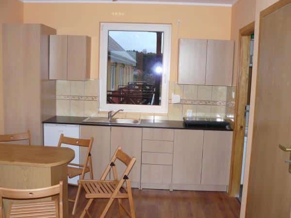 – Aneks kuchenny z czajnikiem, chłodziarką, kuchenką indukcyjną, naczyniami, sztućcami, garnkami i patelnią