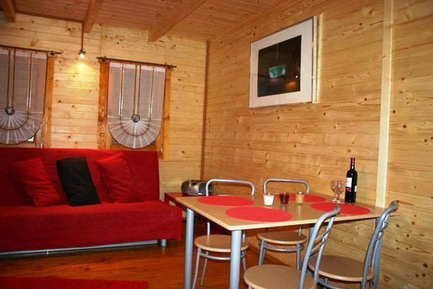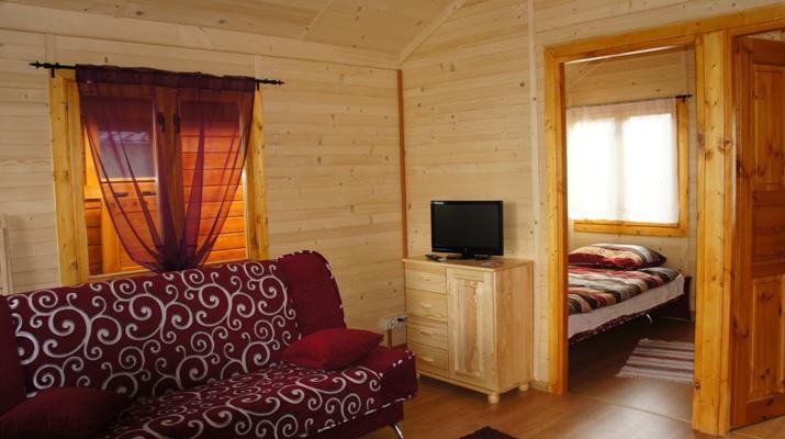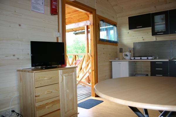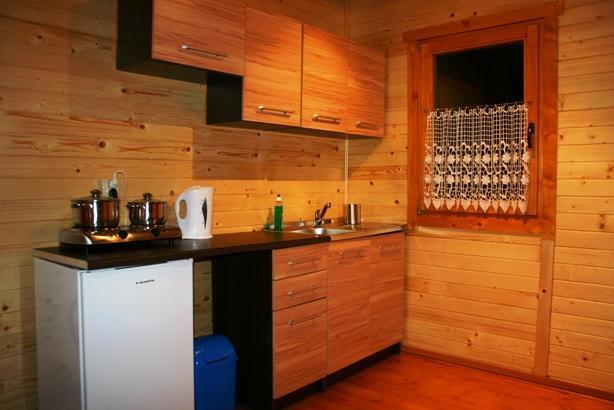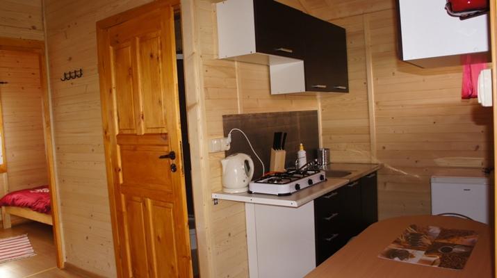 – Salon z aneksem kuchennym, wyposażony w wygodną sofę, telewizor LCD na sosnowej komodzie oraz kompletną kuchnię z lodówką, kuchenką elektryczną i pełnym zestawem naczyń i garnków.