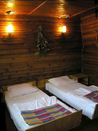 – Drewniane domki rodzinne dla 6 osób z trzema sypialniami, salonem z kominkiem, kuchnią, balkonami z widokiem na jezioro i pełnym węzłem sanitarnym,
