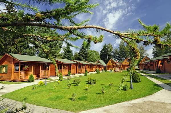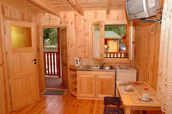 – 10 drewnianych domków parterowych (dla maks. 5 osób), wyposażonych w: