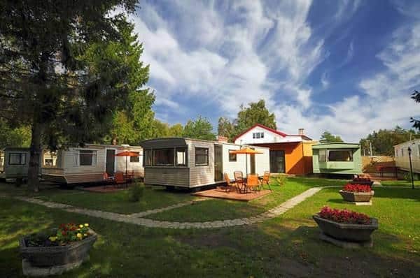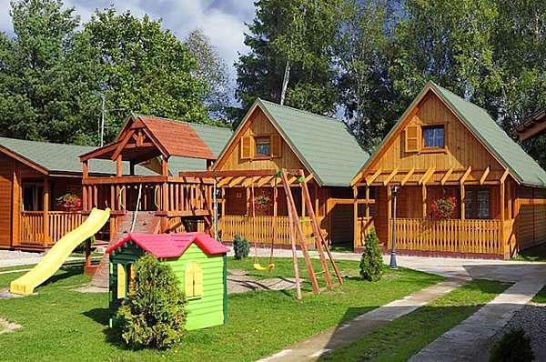– 4 drewniane domki piętrowe (dla maks. 7 osób), które oferują: