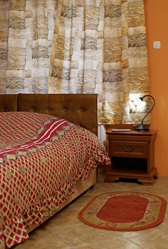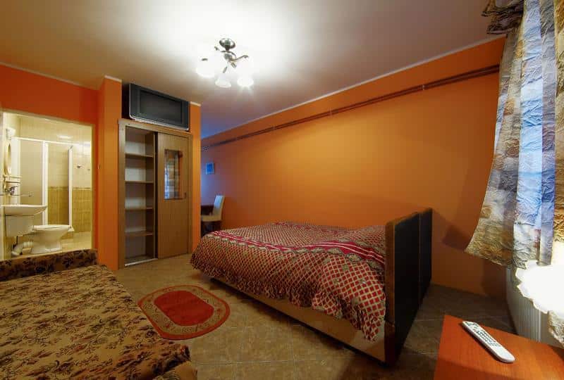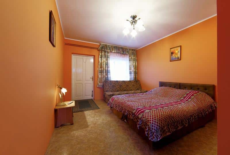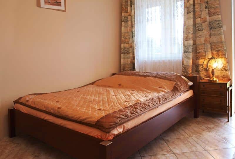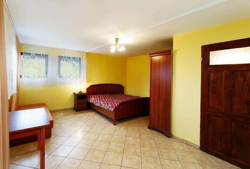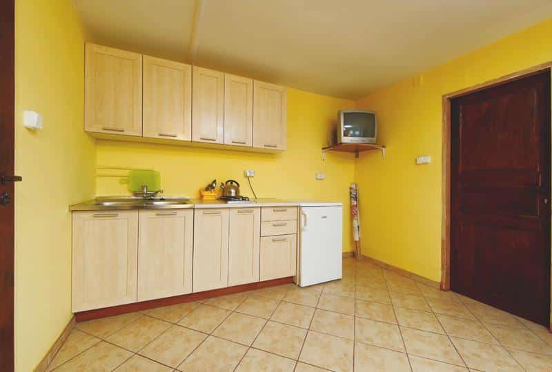 – **Pokoje wczasowe:** Każdy pokój wyposażony jest w aneks kuchenny z lodówką, czajnikiem i kuchenką gazową. W przestronnym wnętrzu znajduje się wygodne łóżko małżeńskie, telewizor oraz dodatkowe łóżko pojedyncze. Do dyspozycji gości jest także łazienka z prysznicem oraz taras z ławeczką.