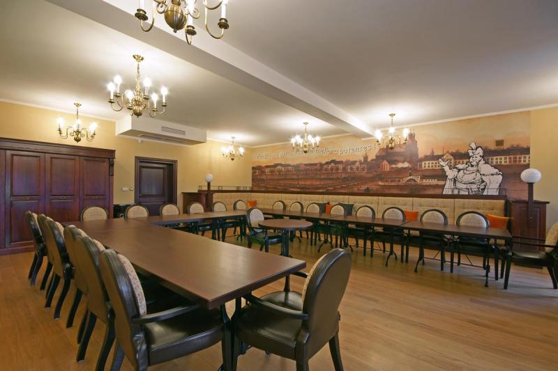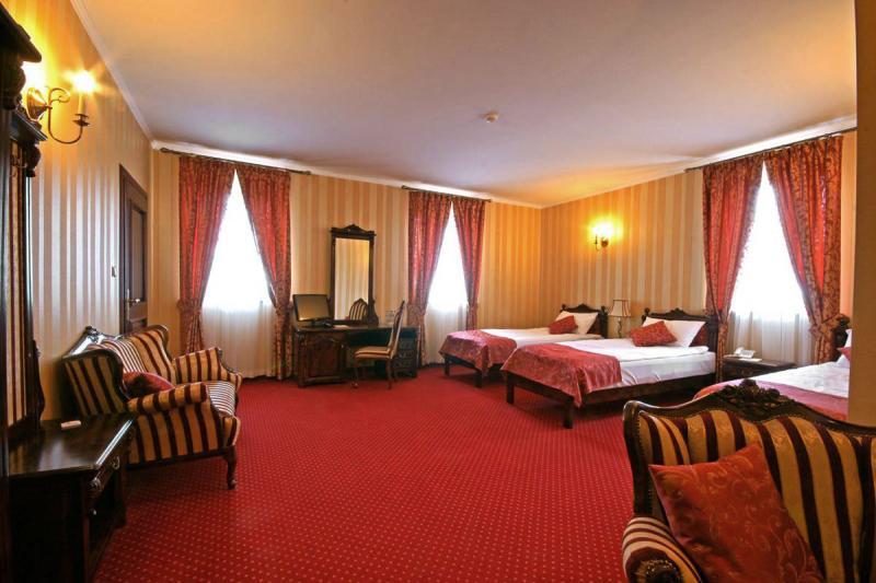 Główny budynek pałacu, wykonany z piaskowca, jest sercem kompleksu. Znajdują się w nim komfortowe pokoje hotelowe, przestronne sale konferencyjne, stylowa restauracja, sala balowa, pub i sauna. Goście mają do wyboru 35 pokoi, w tym apartament oraz pokoje 1-, 2- i 3-osobowe. Każdy pokój jest klimatyzowany i wyposażony w telewizor, internet, telefon oraz minibar, a z okien można podziwiać malownicze widoki na park lub ogrody.