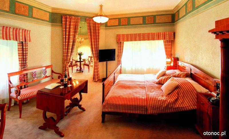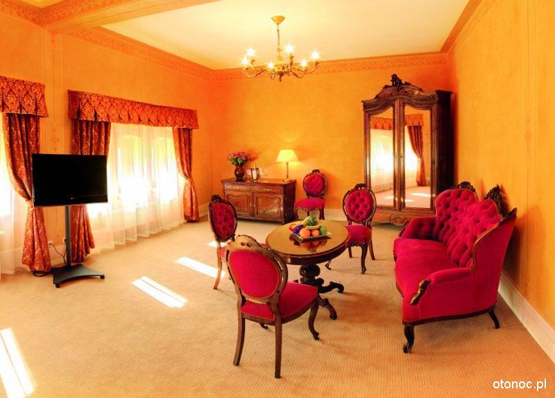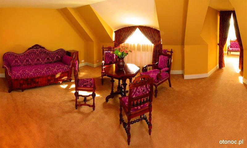 W samym Pałacu znajdą Państwo wnętrza wypełnione oryginalnymi, zabytkowymi meblami, które dodają niepowtarzalnego uroku. Siedemnaście pokoi posiada osobne saloniki, mieszczące się w czterech okrągłych wieżach, z których rozciąga się malowniczy widok na park oraz panoramę okolicznych gór.