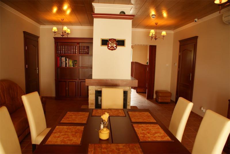 Do dyspozycji Gości jest również stylowy salon z kominkiem, biblioteczka oraz jadalnia. Dla miłośników grillowania przygotowaliśmy specjalne miejsce, a dla najmłodszych plac zabaw. Gospodarstwo znajduje się na 4-hektarowej działce, gdzie można podziwiać pasące się konie.