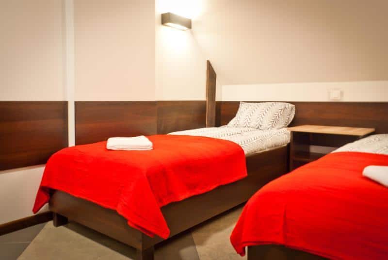– 4 pokoje typu “twin” z dwoma pojedynczymi łóżkami, łazienką (prysznic, umywalka, WC), TV, Internetem oraz balkonem.