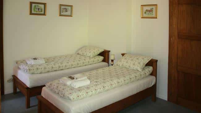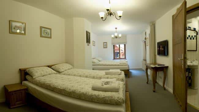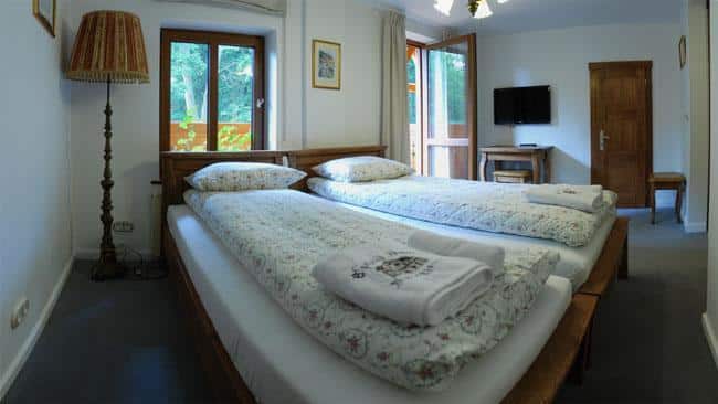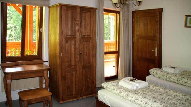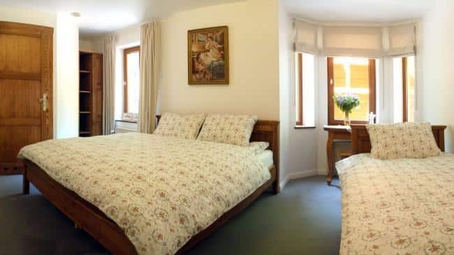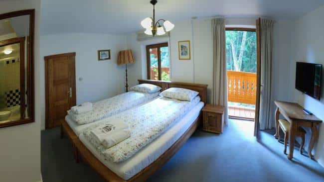 W Alpejskim Dworze znajdziesz urocze pokoje z kojącymi widokami, wyposażone w wygodne drewniane łóżka, ortopedyczne materace oraz pachnącą bawełnianą pościel. Każdy pokój ma własną łazienkę, telewizor i dostęp do Wi-Fi. Na ścianach wiszą prace wyjątkowej artystki, które ukazują piękno Międzygórza.