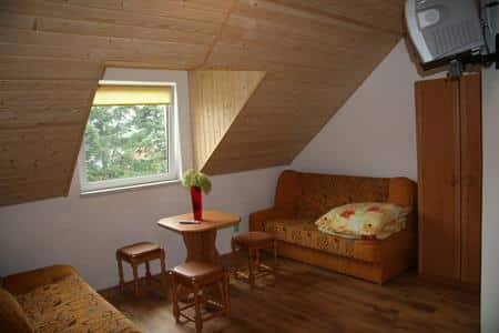 Oferujemy komfortowe pokoje 2-, 3-, 4- i 5-osobowe, każdy z własną łazienką i telewizorem. Do dyspozycji gości oddajemy aneks kuchenny, wyposażony w lodówkę, kuchenkę elektryczną i czajnik bezprzewodowy, co pozwala na przygotowanie posiłków według własnych potrzeb. Dla miłośników plażowania przygotowaliśmy parawany i koce plażowe, a dla tych, którzy lubią spędzać czas na świeżym powietrzu – grill oraz taras z meblami ogrodowymi.