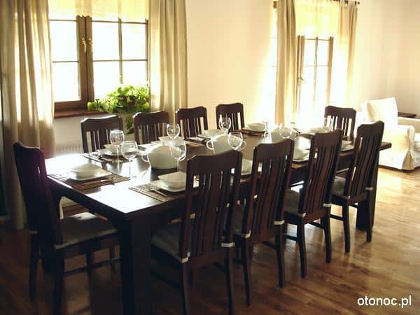 Nasz dom zapewnia komfort o każdej porze roku. Latem zapraszamy na zadaszony taras, idealny na wieczorny relaks, a chłodniejsze dni można spędzić w salonie przy kominku. W salonie znajduje się duży, drewniany stół, przy którym serwujemy pyszne posiłki. W części wypoczynkowej, w pobliżu kominka, znajduje się wygodna kanapa i fotele.