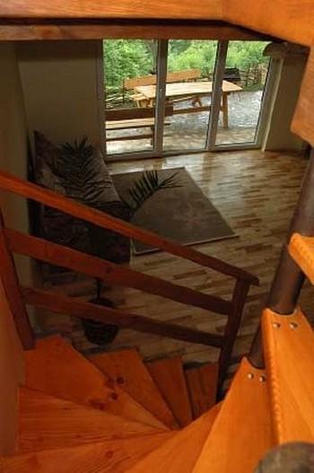 Domek jest dwupoziomowy i zapewnia komfortowy pobyt przez cały rok. Na poddaszu znajdują się dwie sypialnie: jedna dwuosobowa i druga trzyosobowa z balkonem, a także łazienka. Obie sypialnie wyposażone są w pojedyncze łóżka. Na parterze czeka na gości przytulny salon z kominkiem, dużym stołem i telewizją satelitarną, a także w pełni wyposażony aneks kuchenny oraz druga łazienka. W salonie można dodatkowo spać na wersalce lub rozkładanym fotelu. Przed domkiem znajduje się taras z miejscem do siedzenia.