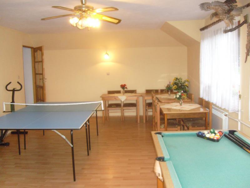– sala kominkowa z telewizją satelitarną, sprzętem stereo, stołem bilardowym, tenisem stołowym i innymi grami.