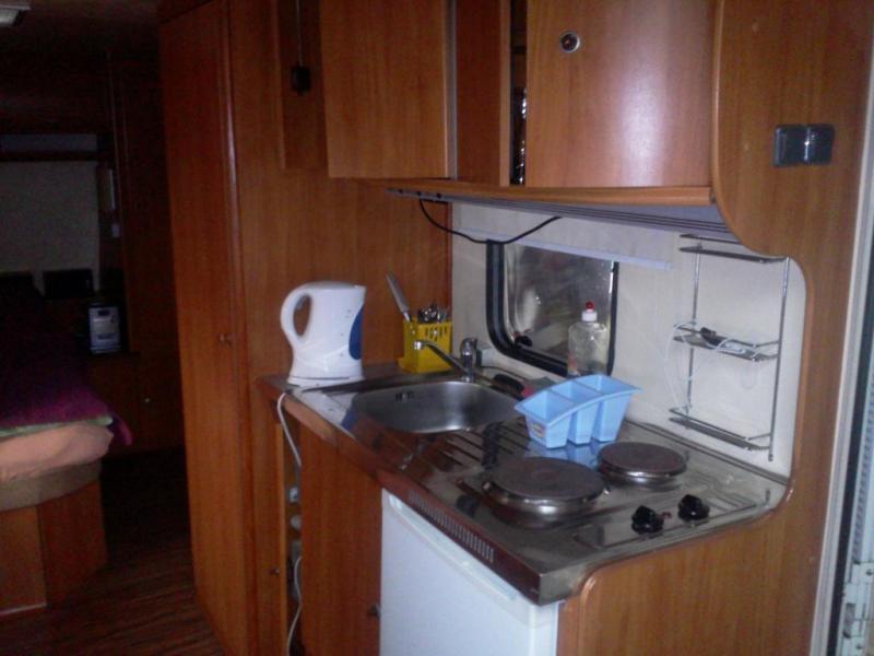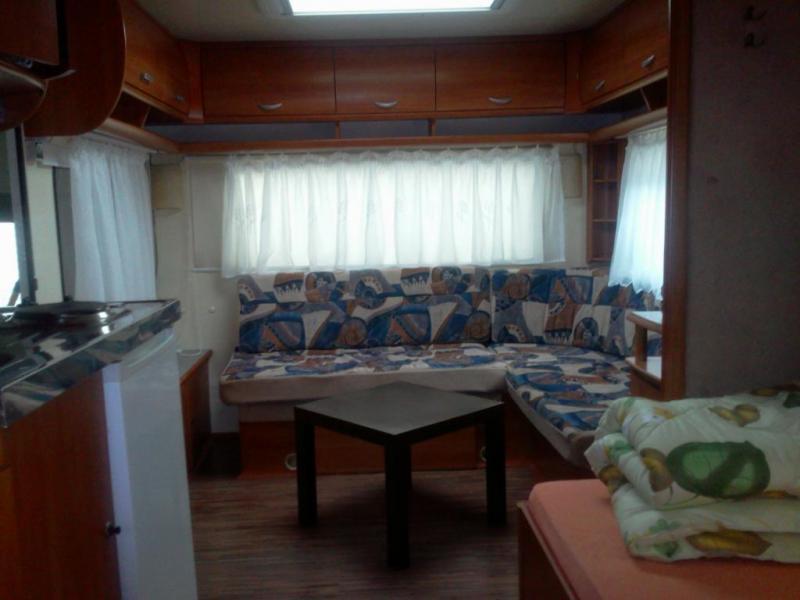Przyczepa oferuje dwa oddzielne pomieszczenia sypialne, które można oddzielić przesuwanymi drzwiami. W jednym z nich znajduje się kuchnia połączona z pokojem dziennym, który na noc przekształca się w sypialnię. W drugim pomieszczeniu czeka na Państwa wygodne podwójne łóżko.