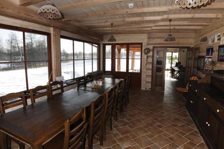 Do dyspozycji gości jest lodówka na piętrze oraz przestronny salon z kominkiem, który idealnie nadaje się na spotkania firmowe czy relaks przy tenisie stołowym. Nasza drewniana jadalnia z panoramicznym widokiem na jezioro zapewnia niezapomniane poranki przy kawie.