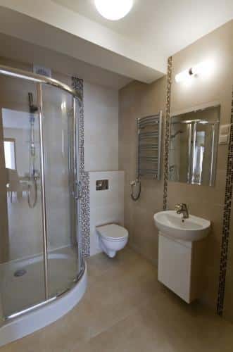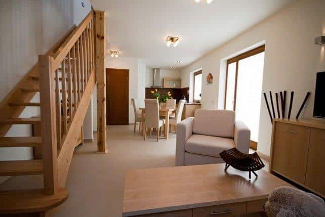 – kuchnia: lodówka, kuchenka elektryczna 4-palnikowa, okap, sztućce, garnki, patelnia, szkło (szklanki, filiżanki, kieliszki do wina), czajnik elektryczny, zastawa obiadowa