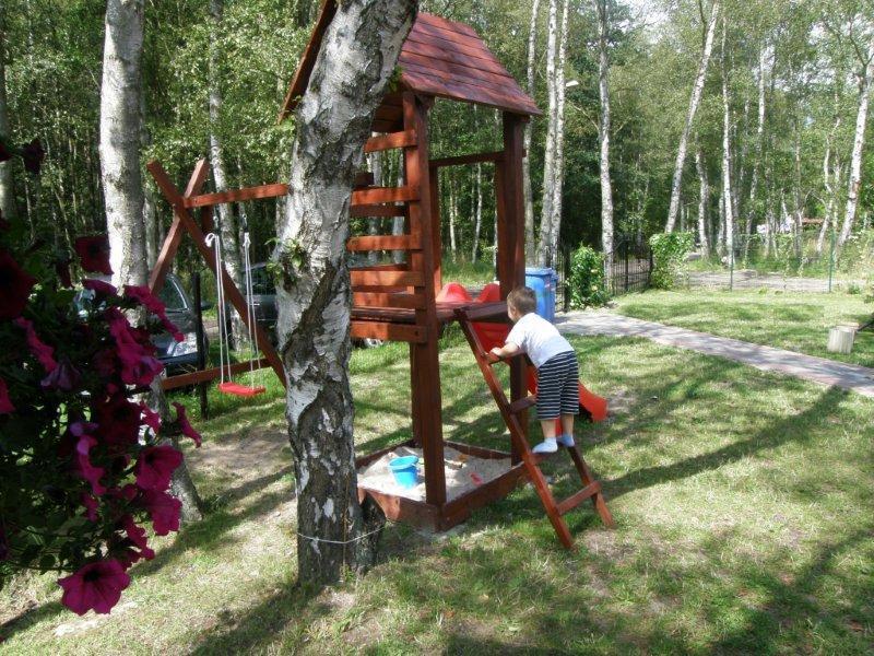 Każdy domek posiada również taras z indywidualnym grillem, stolikiem i krzesełkami, co pozwala na relaks na świeżym powietrzu. Na terenie obiektu znajdą Państwo także altanę, wspólną kuchnię z palnikami gazowymi oraz plac zabaw dla dzieci.