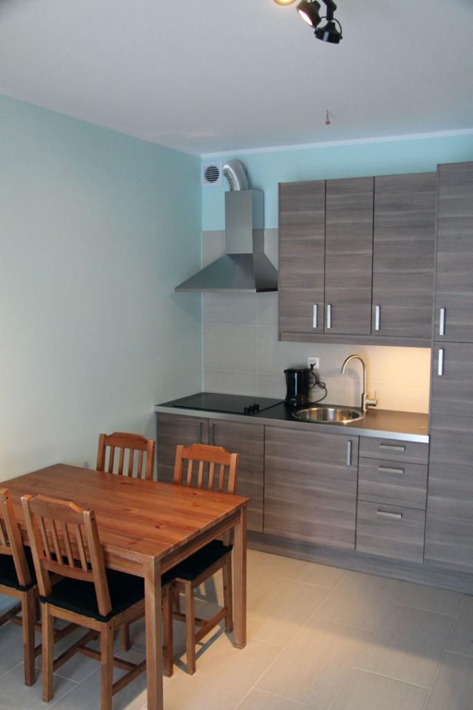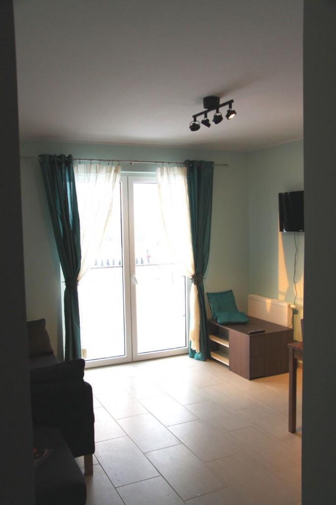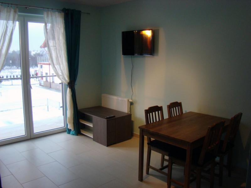 Salon, poza telewizorem, to również część jadalna i kuchenna. Kuchnia w pełni wyposażona, lodówka, ekspres do kawy, płyta grzewcza, toster itp. do dyspozycji Gości. Spędzając czas na balkonie można obserwować, co dzieje się na ogrodzonej posesji, w tym również na basenie (kontrola starszych dzieci – na zasadzie “ufaj, ale sprawdź”, a przy tym nie przemęczaj się za bardzo!)