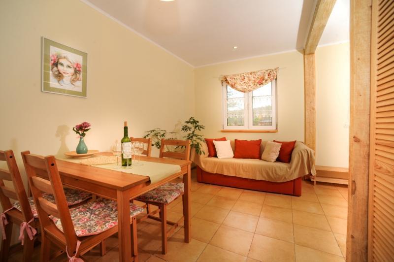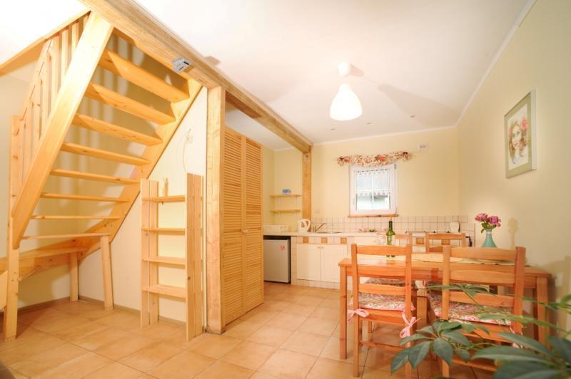 – W pełni wyposażoną kuchnię: lodówka, płyta elektryczna, czajnik, zastawa stołowa i korkociąg do wina.